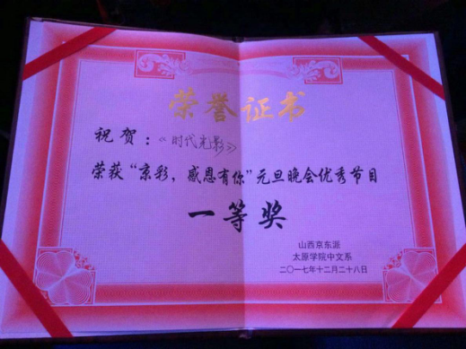 由我院研究生会学术科技及办公室选送的节目《时代光影》参加了本次京东高校元旦晚会,节目通过人物剪影展示了我国改革开放后的瞩目成就,通过短暂的十分钟讲述了我国翻天腹地的变化,新颖的节目形式,流畅的表演节奏,高水平的节目质量获得了各高校的一致好评并获得本场晚会的一等奖。